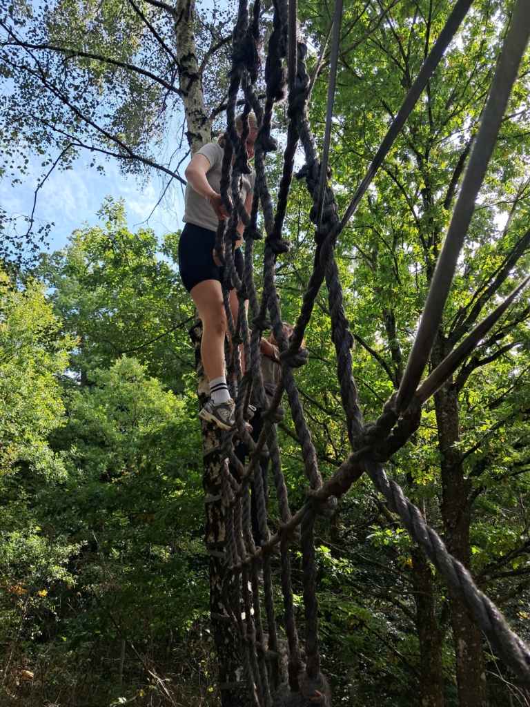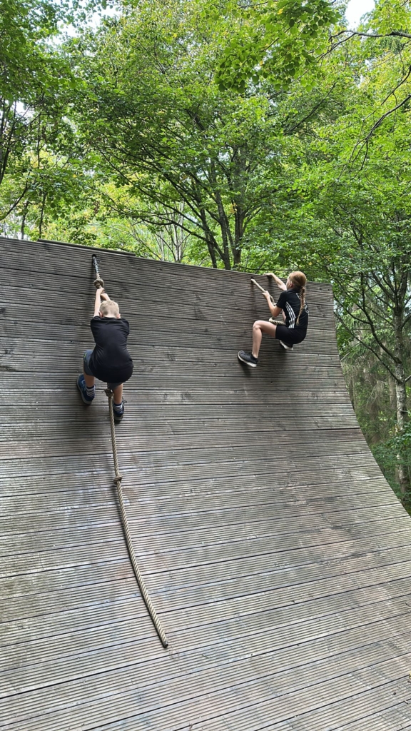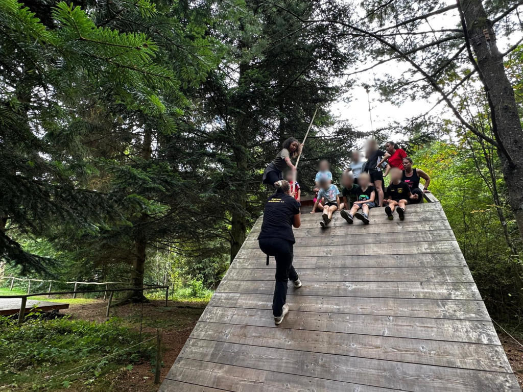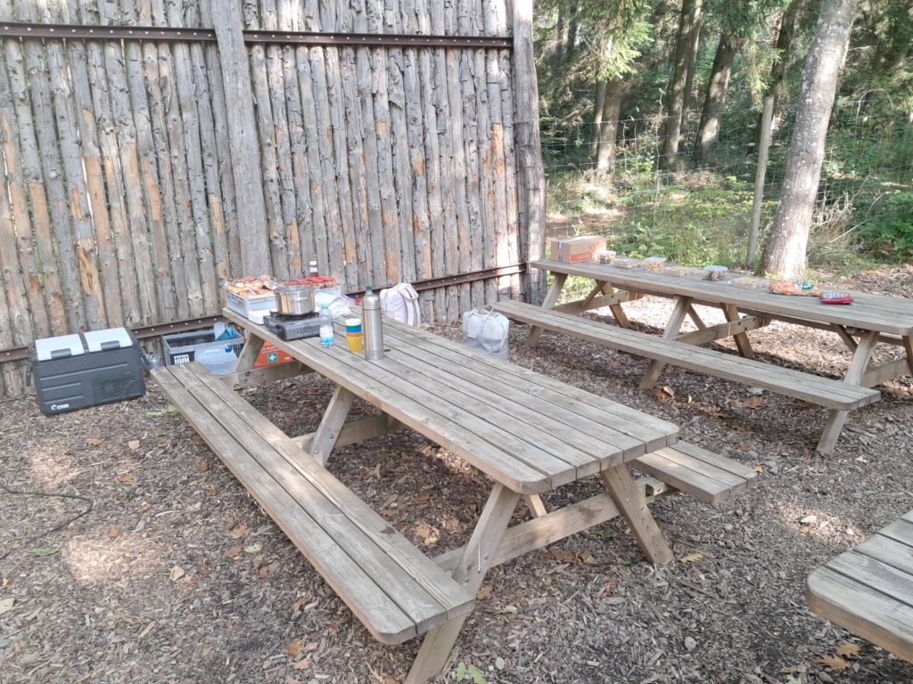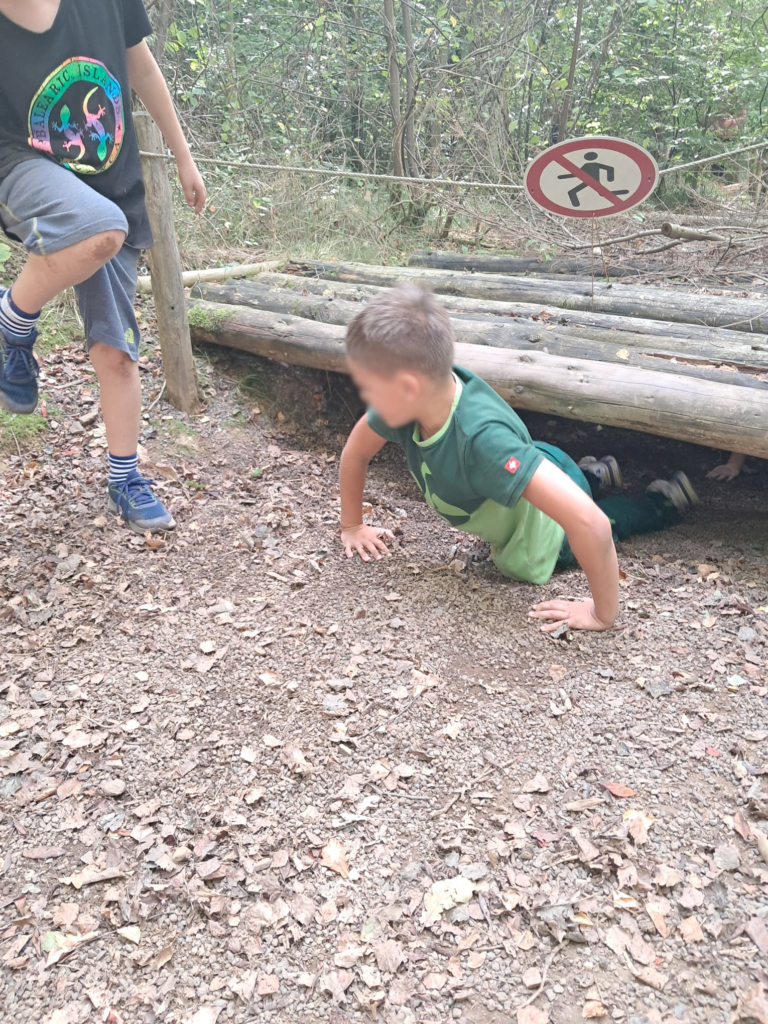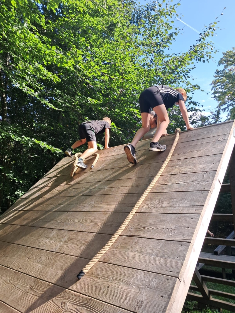So wurde bereits die Busfahrt nach Nettersheim ein lustiges und lautes Unterfangen. Angekommen schlugen wir unser Camp unter Bäumen in der Natur mitten im Wald auf. Stromerzeuger, Kühlbox und Campingkocher unterstützten uns bei der Lagerverpflegung in Form von Hotdogs, Getränken und Knabbereien. Bewegung an der Luft macht hungrig! Nach Einweisung in die Hindernisbahn und Tipps zu Klettertechniken mit und ohne Teamerfordernis nahmen unsere Kids den Parcours bei bestem Wetter in Angriff. Mehrere Runden wurden gedreht, bei denen sich bei den Hindernissen für jeden ein besonderer Favorit herausbildete.