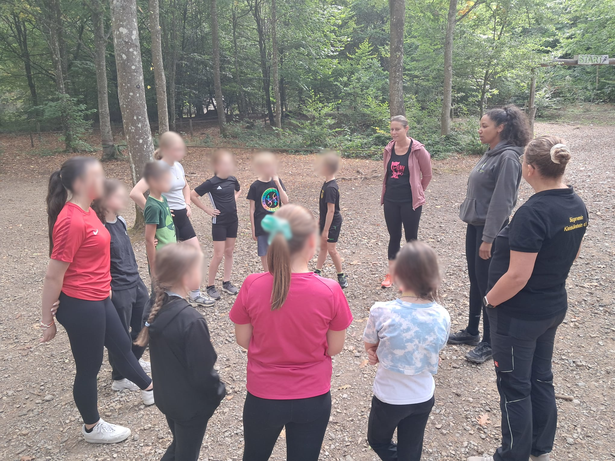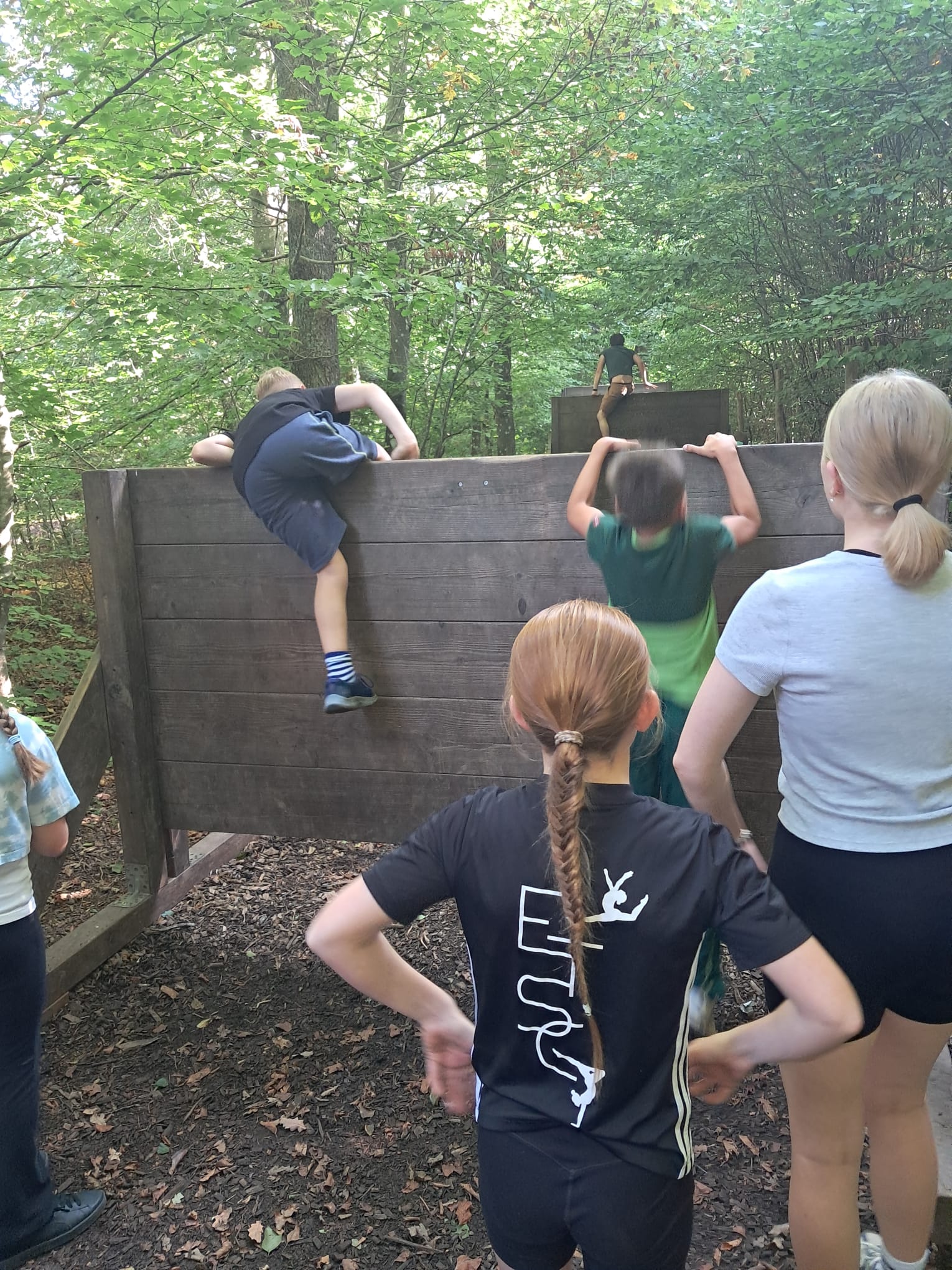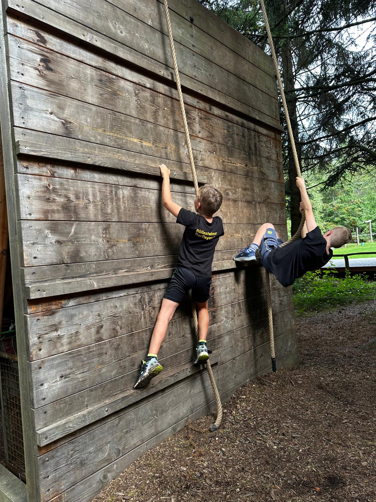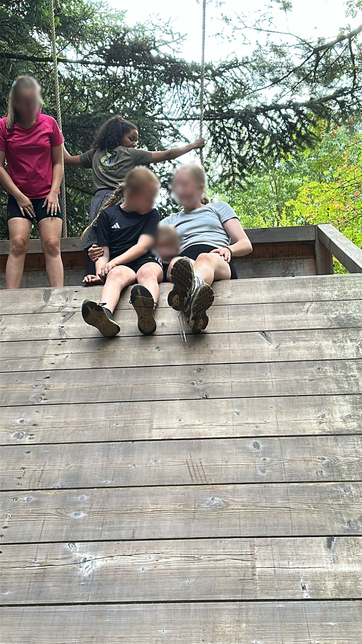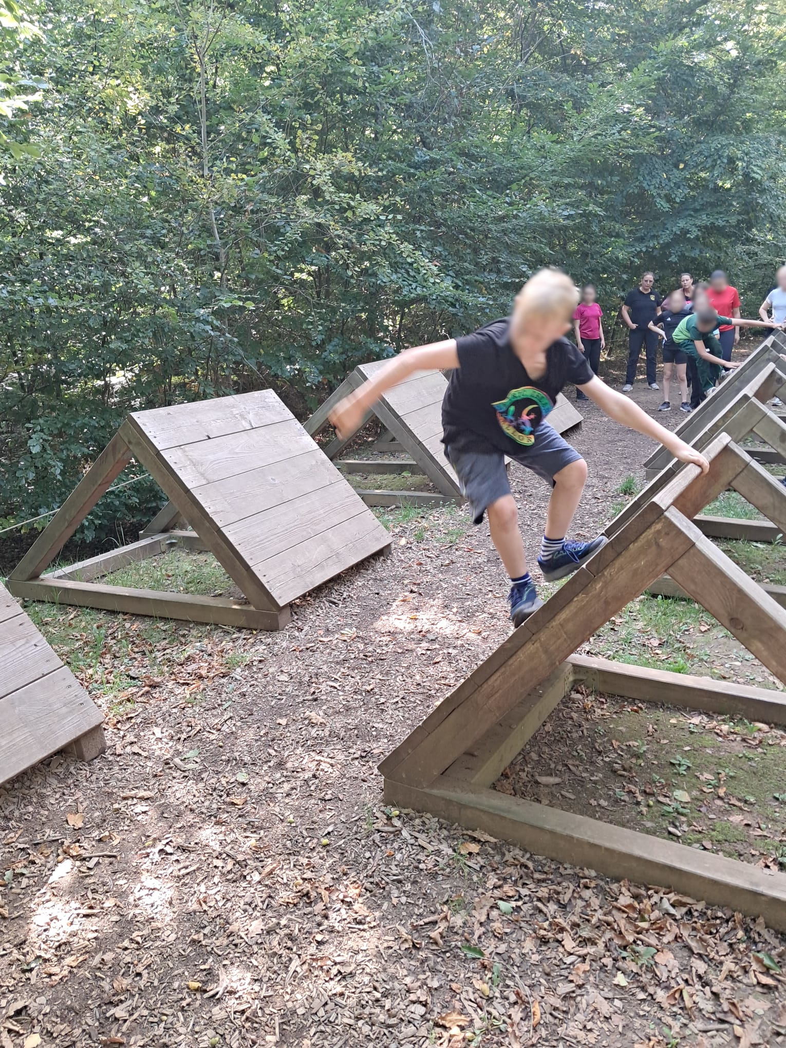 So wurde bereits die Busfahrt nach Nettersheim ein lustiges und lautes Unterfangen. Angekommen schlugen wir unser Camp unter Bäumen in der Natur mitten im Wald auf. Stromerzeuger, Kühlbox und Campingkocher unterstützten uns bei der Lagerverpflegung in Form von Hotdogs, Getränken und Knabbereien. Bewegung an der Luft macht hungrig! Nach Einweisung in die Hindernisbahn und Tipps zu Klettertechniken mit und ohne Teamerfordernis nahmen unsere Kids den Parcours bei bestem Wetter in Angriff. Mehrere Runden wurden gedreht, bei denen sich bei den Hindernissen für jeden ein besonderer Favorit herausbildete.