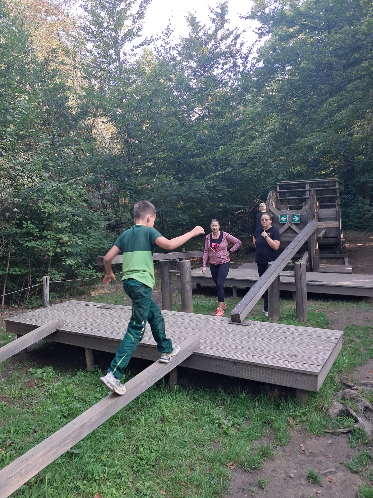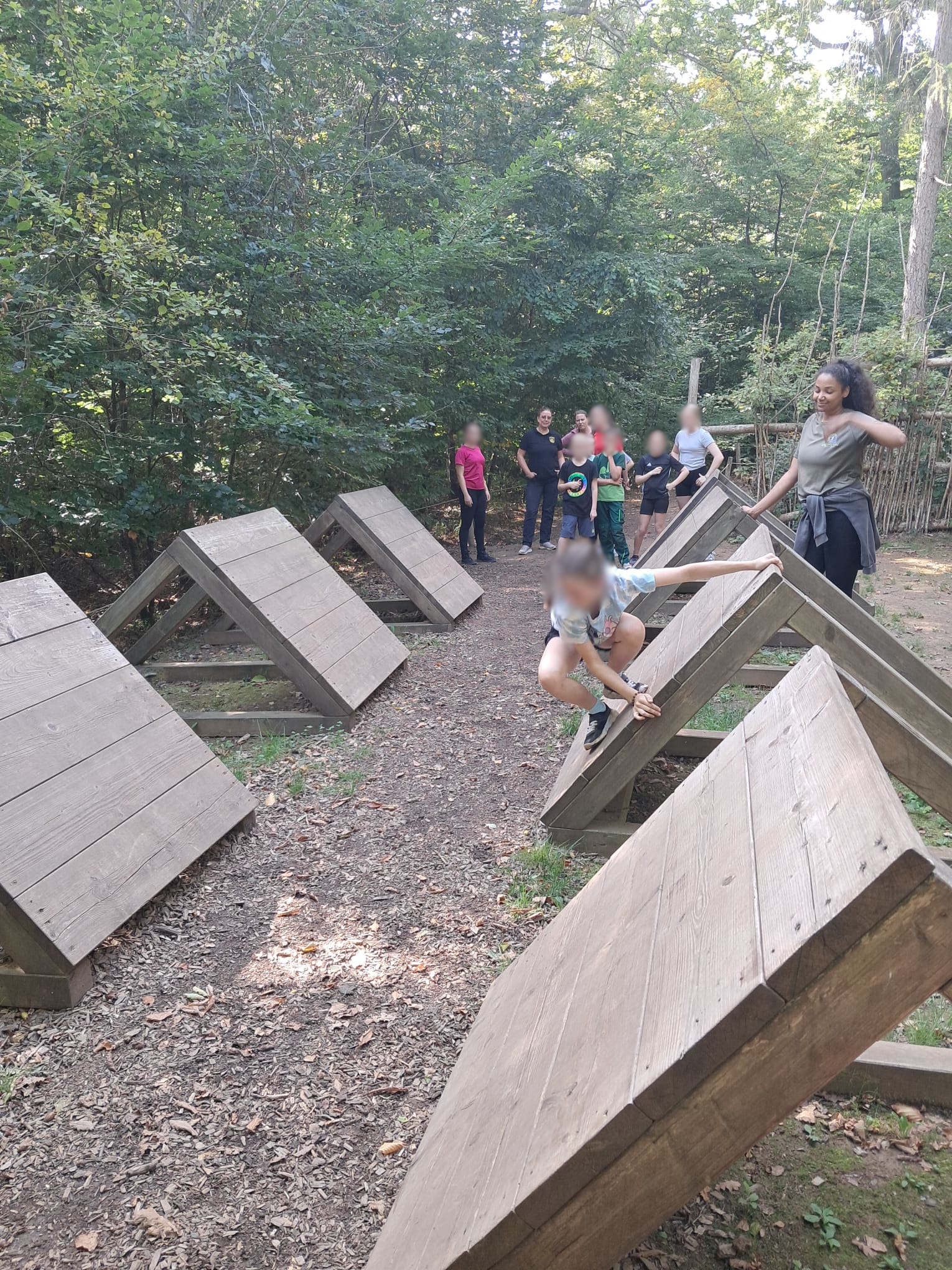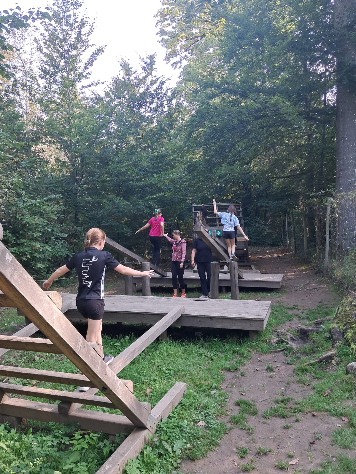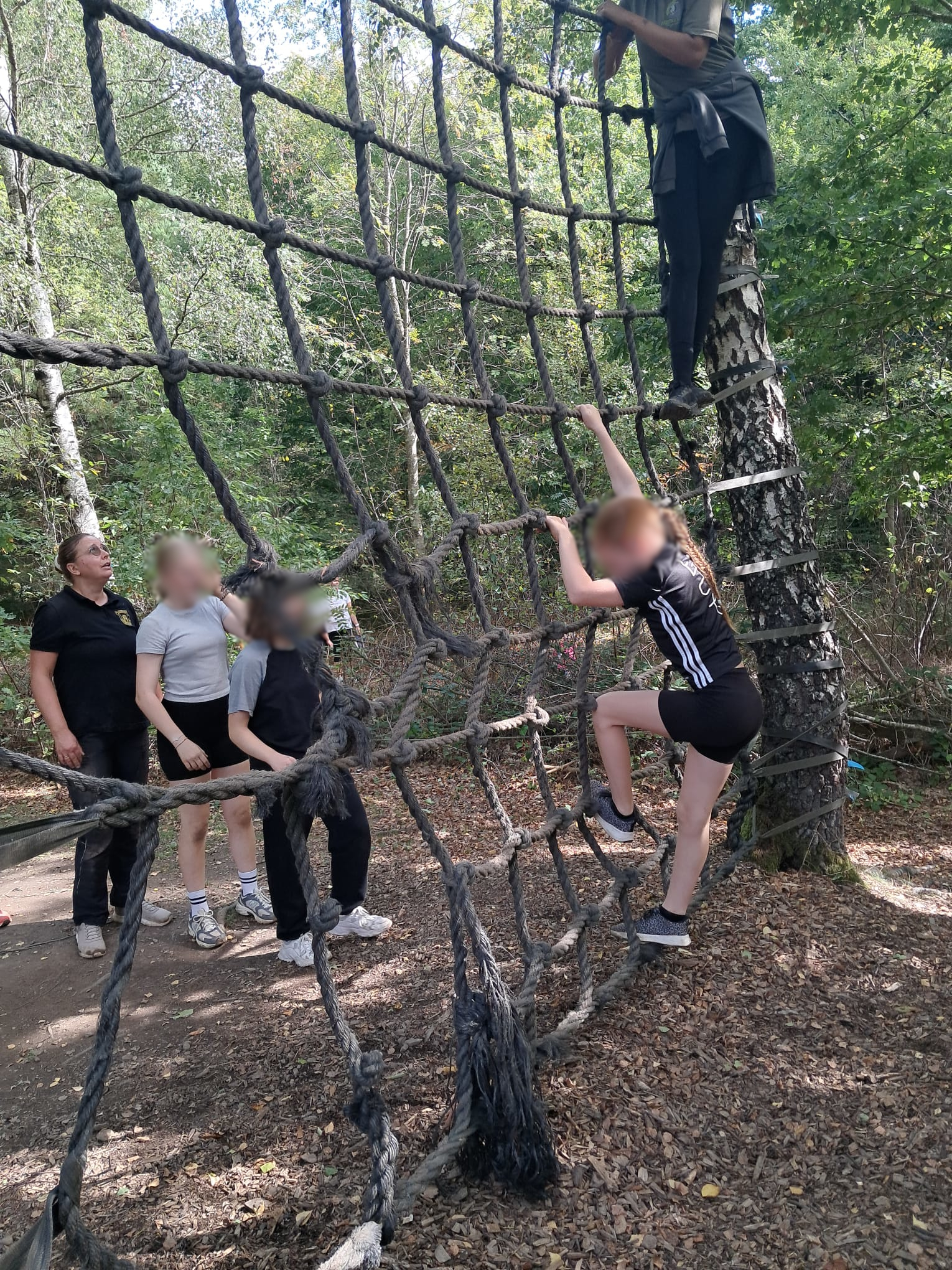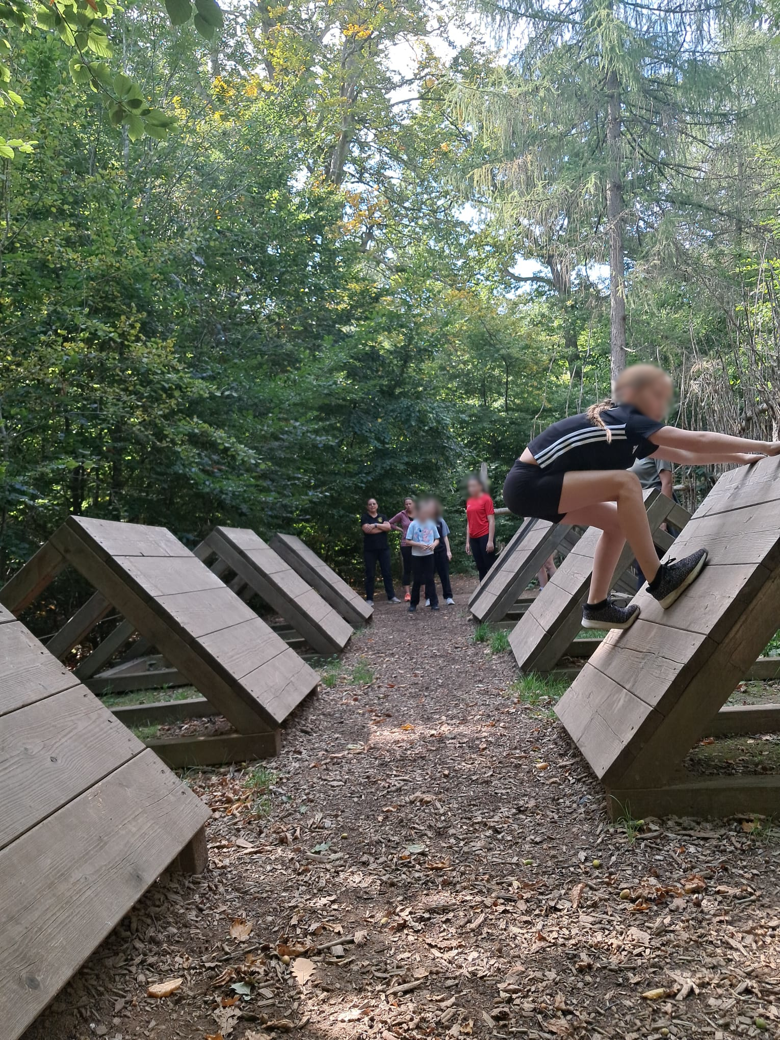 So wurde bereits die Busfahrt nach Nettersheim ein lustiges und lautes Unterfangen. Angekommen schlugen wir unser Camp unter Bäumen in der Natur mitten im Wald auf. Stromerzeuger, Kühlbox und Campingkocher unterstützten uns bei der Lagerverpflegung in Form von Hotdogs, Getränken und Knabbereien. Bewegung an der Luft macht hungrig! Nach Einweisung in die Hindernisbahn und Tipps zu Klettertechniken mit und ohne Teamerfordernis nahmen unsere Kids den Parcours bei bestem Wetter in Angriff. Mehrere Runden wurden gedreht, bei denen sich bei den Hindernissen für jeden ein besonderer Favorit herausbildete.